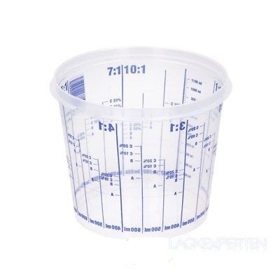 Farbmischbecher 1400 ml ohne Deckel. Mischbecher für Farbe, Lack, Lasuren u.a. chemische Produkte. Die Farbmischbecher haben Skalen von 1:1 bis 1:10, zusätzlich Skalen in Prozent und Milliliter. So können Sie insbesondere zweikomponentige Lacke besonders gut abmischen.